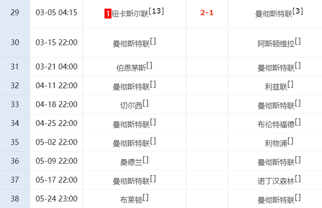 根据赛程安排,曼联下一轮比赛将在主场对阵维拉,万一输掉比赛,曼联随时会跌出前四。在后面的比赛中,曼联还将对阵切尔西和利物浦,这3场硬仗的结果,随时将决定曼联本赛季的争四命运。一旦这3场争四大战输给对手,很可能导致曼联痛失欧冠资格,无缘下赛季欧冠!